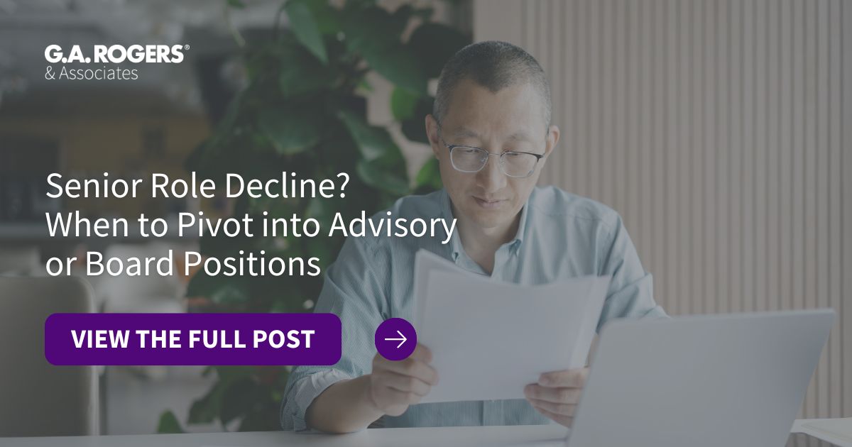 Stepping away from the C-suite does not mean stepping out of leadership. It may simply be the right moment to lead in a new capacity. If you are ready to explore your next chapter, G.A. Rogers & Associates can help you pivot into meaningful advisory or board work. Connect with us to explore executive and board-level opportunities today.